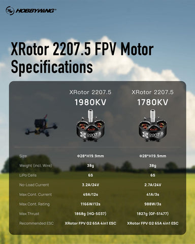 HOBBYWING XRotor 2207.5 brushless motor is available in both 1780KV and 1980KV versions to match different FPV needs:
